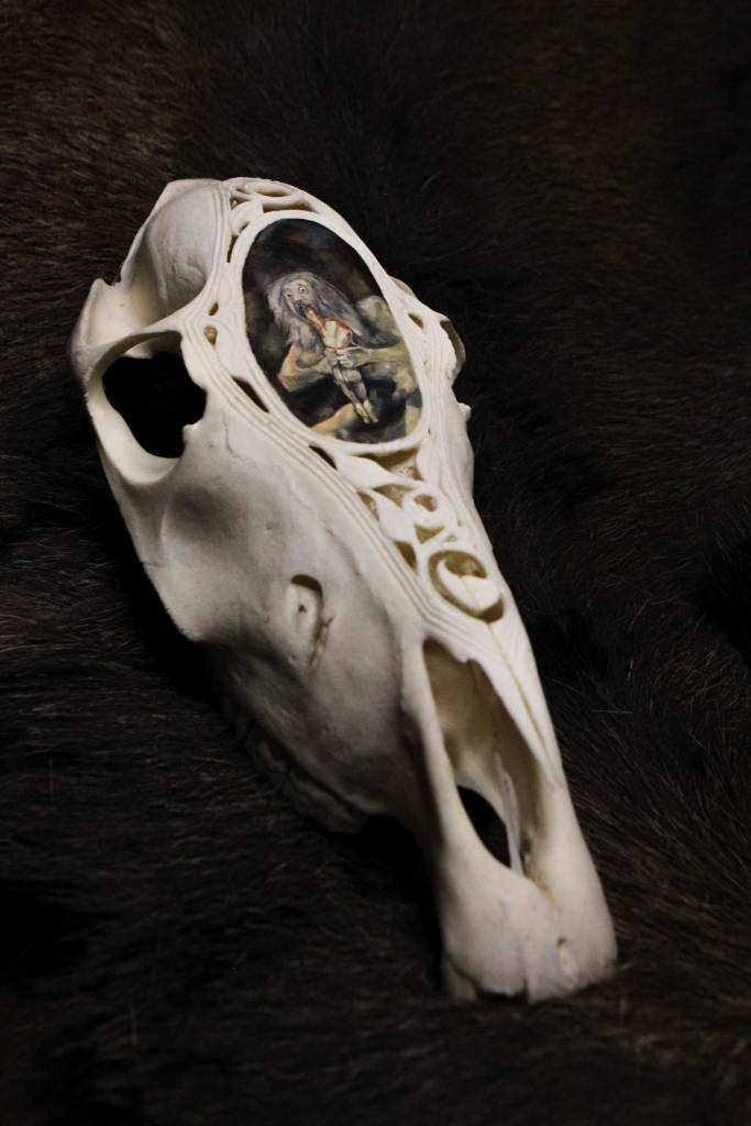 Grim: Siamo partiti da Sirah con il skull carving, io ho aggiunto la mia arte macabra. Poi si è aggiunta Niki che fa sempre skull carving ma con uno stile diverso da quello di Sirah incidendo principalmente su pezzi piccoli da cui ricava splendidi gioielli. Magda è arrivata dopo che per molto tempo mi ero convinto che servisse qualcuno che dipingesse, perché ero sicuro che la cosa potesse funzionare. Gli altri due rami che viaggiano in parallelo sono Varg con le sue creazioni in cuoio, ma che è tuttofare quindi ben si presta anche alla pittura e i WildMatters che vanno a coprire l’aspetto divulgativo. Abbiamo poi dei collaboratori esterni che integrano con il macramè e l’elettroformatura. Queste ultime sono esternalizzate, perché sono tecniche che richiederebbero nuove attrezzature e tanto tempo per esercitarsi, così abbiamo preferito integrarle tramite collaboratori fidati. Per il resto direi che tutte le tecniche necessarie alla nostra produzione sono coperte, a volte ci sovrapponiamo, ci formiamo a vicenda, ci stimoliamo vicenda.